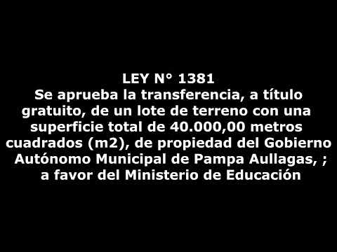 ARTÍCULO ÚNICO. De conformidad con el numeral 13 del Parágrafo I del Artículo 158 de la Constitución Política del Estado, se aprueba la transferencia, a título gratuito, de un lote de terreno con una superficie total de 40.000,00 metros cuadrados (m2), de propiedad del Gobierno Autónomo Municipal de Pampa Aullagas, ubicado en la zona Philpata, sector Este, del Municipio de Pampa Aullagas, Provincia Ladislao Cabrera del Departamento de Oruro, registrado en las oficinas de Derechos Reales de Challapata, bajo el Folio Real con Matrícula Computarizada N° 4.08.2.01.0000041, cuyas colindancias son: Al Norte, con la TCO Marka Pampa Aullagas; al Sur, con la Carretera Pampa Aullagas -Quillacas; al Este, con la TCO Marka Pampa Aullagas; y al Oeste, con la TCO Marka Pampa Aullagas; a favor del Ministerio de Educación, con destino exclusivo para la construcción de la "Unidad Académica Pampa Aullagas", dependiente de la Escuela Superior de Formación de Maestras y Maestros Caracollo - Oruro, de conformidad a lo establecido en la Ley Municipal N° 035 de 20 de agosto de 2019, modificado por la Ley Autonómica Municipal N° 044/2021 de 09 de junio de 2021, emitido por el Gobierno Autónomo Municipal de Pampa Aullagas.