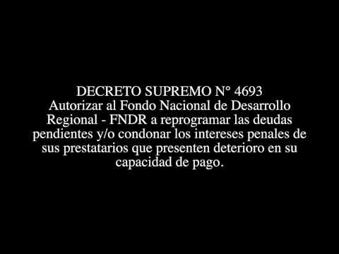 El presente Decreto Supremo tiene por objeto autorizar al Fondo Nacional de Desarrollo Regional - FNDR a reprogramar las deudas pendientes y/o condonar los intereses penales de sus prestatarios que presenten deterioro en su capacidad de pago.